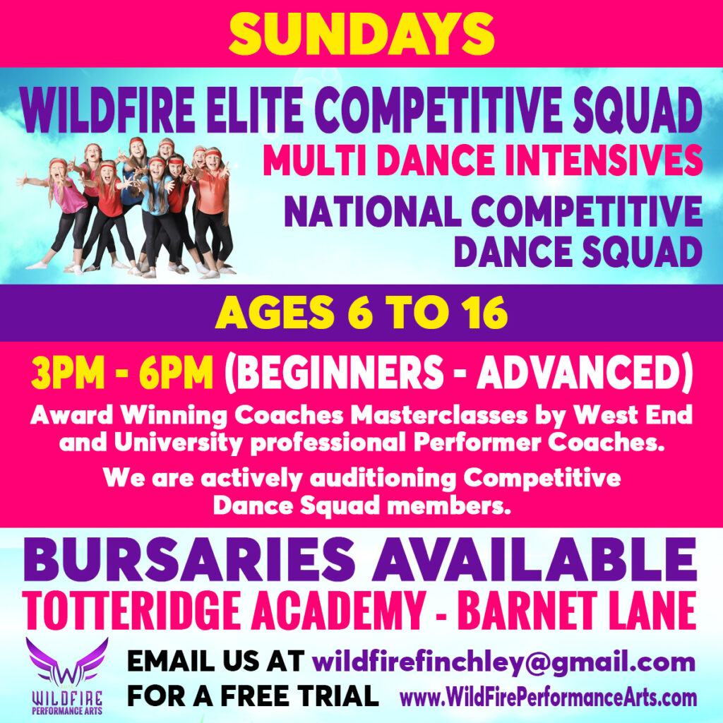 WildFire Squad Sundays, 3pm to 6pm – Our Competitive Athletic Dance Squad, trains in all styles and genres, attending all major UK competitions from Street Dance, to Ballet, to Acrobatics heats at major UK Theatres and Venues.